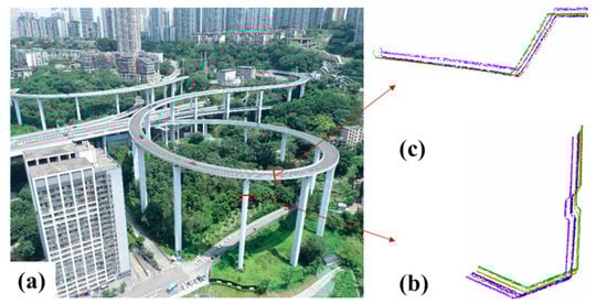 Comparison of enlarged registration results of Sujiaba Bridge based on four methods. (a) UAV image of Sujiaba Bridge. (b) Enlarged details of specified cross-section in bridge piers with top view. (c) Enlarged details of specified cross-section in main girders with side view. The target point cloud is shown in red. The result of FPFH, SHOT, RoPS, and our descriptor is shown in purple, orange, green, and blue, respectively.