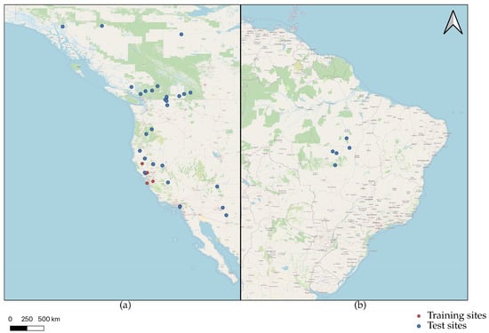 Study areas from North America (a) and South America (b), all the wildfire regions are generated using QGIS and overlaid on Base Map Layer in Open Street Map.