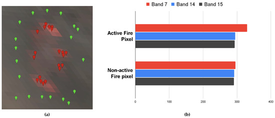 Inspections on the mean values for burning areas and non-burned areas in different bands. (a) the GOES-R ABI image captured at 6 p.m. on 8 September 2020, with composition R: Band 7, G: Band 14, B: Band 15. Red pins represent active fire pixels, green pins represent non-active fire pixels. (b) The mean values of randomly sampled pixels within burning areas and non-burning areas.