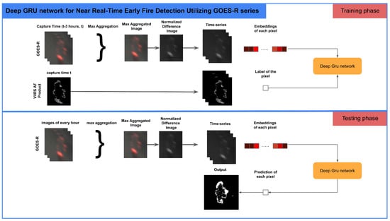 The overall methodology of GRU-based early fire detection using GOES-R data is shown in Figure 3. The main framework mainly consists of two parts, preprocessing for embedding generation and Deep GRU network for active fire detection.