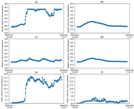 Inspections on time series of Band 7 (a), Band 14 (c), and Normalized difference value (e) of Burned area and time series of Band 7 (b), Band 14 (d), and Normalized difference value (f) of Unburned area. Study area: Creek Fire, California between 5 September 2020 12:00 to 6 September 2020 12:00.