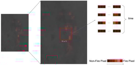 The GOES-R dataset is pre-processed using Google Earth Engine [27]. As discussed in Section 2, MIR Band is sensitive to burning biomass on the ground, and TIR band is served as a good contrast to the MIR band. Thus, for each GOES-R image, the normalized difference () between MIR band and TIR band is generated according to Equation (1) to provide a better indication of the active fire. The range of the normalized difference is between 0 and 1. But since Band 7 and Band 14 have similar values as shown in Figure 4, the normalized difference value is close to 0. Hence, we scale up the normalized difference by a factor of 100.