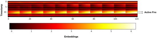 As shown in the Figure 7, the time-series of the embeddings show the progression of the wildfire. For each row, it represents the flattened 11 by 11 image patch. The neighboring pixels above the center pixel locates in the columns of the left, while the neighboring pixels below the center pixel are in the right columns. And the center pixels are located at column 60. For each column, it represents the fluctuation of band values. When the wildfire progresses from bottom-right to top-left in given image patch, the highest value in its neighborhood flows from right to left in the embedding. For each 11 pixels in the embedding map, it can be observed that bright spots shifted from right to left. Also, the pixels on the right columns tend to have more numbers of high value pixels than the pixels on the left columns. This represents the wildfire is at the bottom of the image patch. Especially, when the highest value locates at the center pixel, the center pixel is more likely to be classified as the fire pixel. The time-series model is possible to leverage the fluctuation of values of center pixel and its neighboring pixels at all previous timestamps to classify the center pixel.