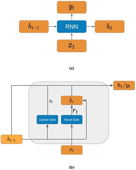 Basic Architecture of Recurrent neural network (a) and Architecture of Gated Recurrent Unit (b).