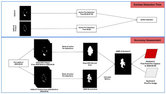 For the earliest detection, the proposed method is compared with FIRMS VIIRS fire product, which provides active fire detection twice a day. The earliest detection time of the proposed method is based on earliest time when fire pixels appear in the output images.
