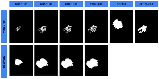 As shown in Figure 12, burned area progression mapping generated from VIIRS 375 m active fire product and proposed method are compared each day after the emerging of the wildfire. For evaluation purpose, the earliest possible Sentinel-2 image can be obtained at 17:30 GMT, 8 September 2020. Each VIIRS burned area mapping is generated by accumulating the available day and night capture at around 08:30 GMT and 20:30 GMT and overlaying on burned areas of previous days. As for the proposed Deep GRU network, the outputs at each hour are accumulated and overlaid on all previous output binary maps. For the baseline, active fire points of GOES-R active fire product before the capture time of Sentinel-2 are accumulated for the same area of interest. Quantitatively, proposed method provides the lowest error of omission and comparable error of commission compared with VIIRS for the Creek Fire as shown in Table 5. At the same time, the proposed method outperforms the baseline in F1 Score and mIoU and shows comparable numbers to VIIRS, which serves as the training label in the training phase. That indicates the proposed method could show preciser location than GOES-R Active Fire product in this study region.