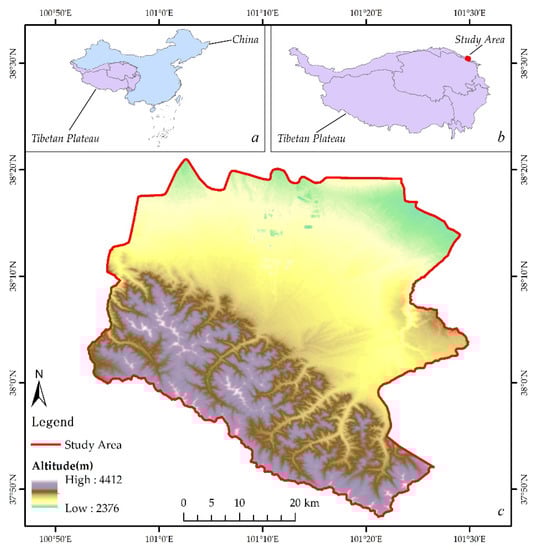 Overview of the study area ((a) represents the location of the Tibetan Plateau in China, (b) represents the location of the study area in the Tibetan Plateau, and (c) represents the altitude map of the study area).