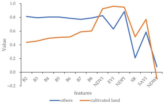 The selection of feature variables has an important impact on the classification results and the efficiency of machine learning algorithms [52]. For the feature selection of cultivated land identification, altitude, slope and aspect are selected, which are important for cultivated land identification [30,53]. In addition, as shown in Figure 3, the features with large differences between cultivated land and other land objects are selected, which can distinguish cultivated land from other areas to the greatest extent and improve the accuracy of our results.