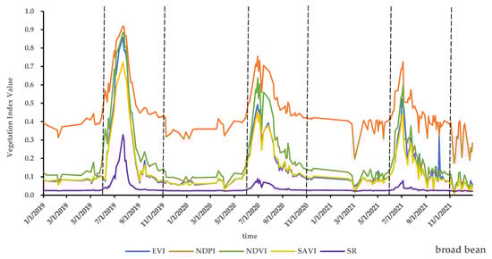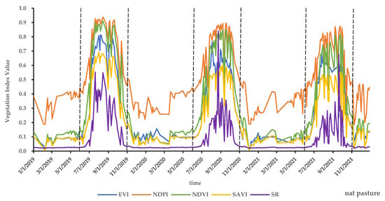 Remote sensing time series images are widely used to extract key phenological periods of crops, and then identify crops [38,39,40]. We carried out a 2019–2021 time series curve analysis of the five vegetation indices (NDVI, EVI, NDPI, SR and SAVI) of oat pasture and other forages (barley, highland barley and broad bean) on the racecourse (Figure 4 and Figure 5). In Figure 4 and Figure 5, we marked June 1 and November 1 with black dotted lines each year for easy observation. The vegetation index of oat pasture is smaller than that of other forages in June but larger than that of other forages in September and October, which is consistent with what we know about local oat pasture growing the most in September and October. June, September and October are the months in which oat pasture differ from other forages. Therefore, in addition to the above features, we also selected the monthly NDVI, EVI, NDPI, SR, and SAVI in June, September and October as separate features, with a total of 24 features (NDVI, EVI, NDPI, SR, SAVI, NDWI, elevation, slope, aspect, ndvi_06 (NDVI in June), ndvi_09 (NDVI in September), ndvi_10 (NDVI in October), evi_06 (EVI in June), evi_09 (EVI in September), evi_10 (EVI in October), ndpi_06 (NDPI in June), ndpi_09 (NDPI in September), ndpi_10 (NDPI in October),sr_06 (SR in June), sr_09 (SR in September), sr_10 (SR in October), savi_06 (SAVI in June), savi_09 (SAVI in September) and savi_10 (SAVI in October)). These monthly vegetation index data were calculated from Sentinel-2 images for the month after the maximum synthesis.