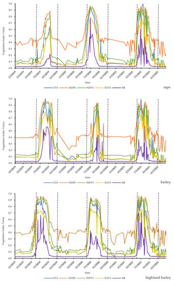 Time series curves of other forage grass vegetation indices (provided by Sentinel-2; the four Figures represent the vegetation index values of rape, barley, highland barley and broad bean).