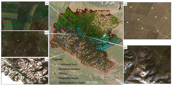 The training and validation data for this study were obtained from the measured data and the Sentinel-2 images provided by the GEE. For cultivated land identification, our goal is to distinguish cultivated areas from non-cultivated areas. To obtain better cultivated land identification results, we divided the study area into five categories (cultivated land, mountain meadow, others, temperate steppe, and alpine meadow steppe) and extracted the cultivated land area for follow-up research. We generated a total of 977 sample points by measured data and visual interpretation of Sentinel-2 high-definition images, including 356 cultivated land sample points, 72 alpine meadow grassland sample points, 234 mountain meadow grassland sample points, 62 temperate grassland sample points and 253 other sample points scattered outside the above categories. The number of sampling points also depends on the area occupied by each category. Figure 6 is the distribution map of cultivated land identification sample points. The five types of sample points are represented by different colors, and the typical areas of each type are shown in the form of subsets (Figure 6a–e). The same sample data were used for the identification of cultivated land in 2019, 2020 and 2021, as there was little change in the amount of cultivated land in the racecourse from year to year.