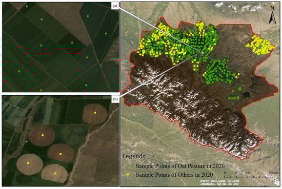 Oat pasture identification sample points in 2020 ((a,b) represents show subsets in which samples containing oat pasture and others are found).