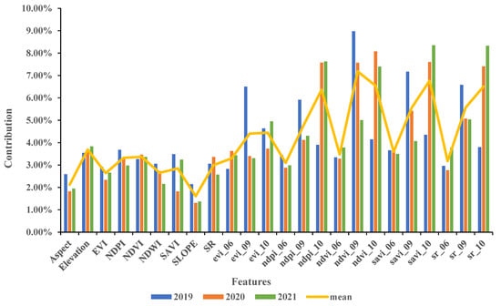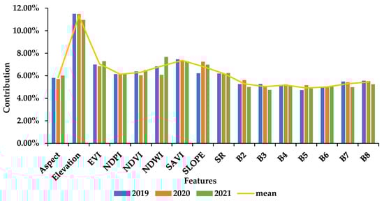 We took the proportion of feature importance as the contribution of the feature and present Figure 10 and Figure 11. As seen from Figure 10, except for the relatively high contribution rate of Elevation (11.31%), the contributions of other features are not much different. There was no significant difference between the contribution rates of features in 2019, 2020, and 2021.
