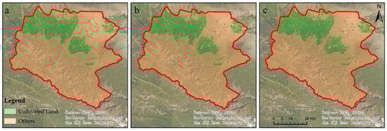 Cultivated land identification results ((a–c) represents the cultivated land identification results of 2019, 2020 and 2021, respectively).