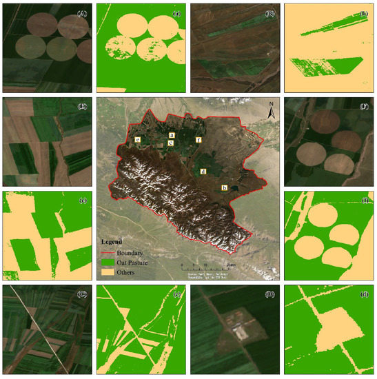 Compared with previous studies, our oat pasture classification accuracy is relatively high, which is mainly due to the following reasons: (1) the collection of real data and the selection of characteristic variables are theoretically supported; (2) before classifying oat pasture, we carried out cultivated land identification, and classified oat pasture based on cultivated land, which may improve our classification accuracy of oat pasture; and (3) the classification results of oat pasture only include two categories (oat pasture and others), and this classification method has high precision.