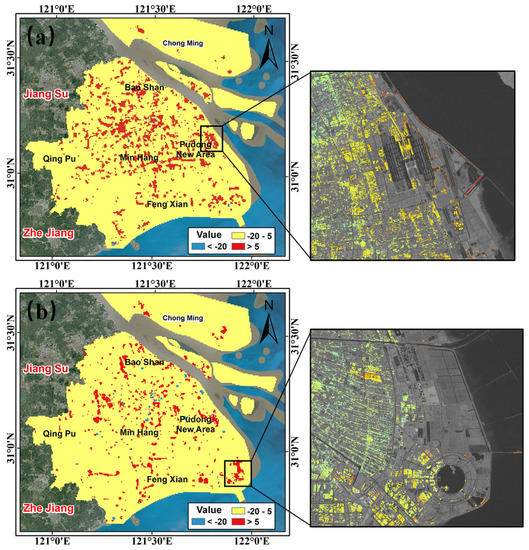 - Chen, J.; Wu, J.; Zhang, L.; Zou, J.; Liu, G.; Zhang, R.; Yu, B. Deformation Trend Extraction Based on Multi-Temporal InSAR in Shanghai. Remote Sens. 2013, 5, 1774. [Google Scholar] [CrossRef]
