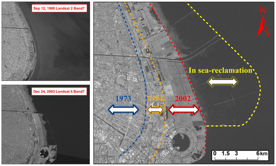 - Shi, Y.; Huang, C.J.; Shi, S.; Gong, J.Y. Tracking of Land Reclamation Activities Using Landsat Observations—An Example in Shanghai and Hangzhou Bay. Remote Sens. 2022, 14, 464. [Google Scholar] [CrossRef]