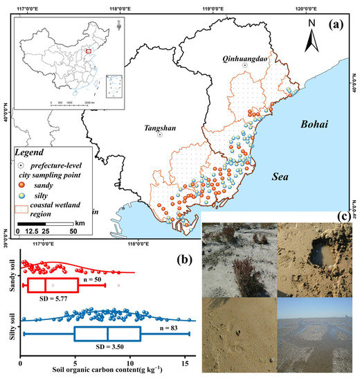 The sampling area (Qinhuangdao and Tangshan coastal wetland areas) has a unique geographical location in an important area of the Bohai Sea Economic Circle and is rich in wetland resources. In November 2020, coastal wetland soil samples (0~30 cm) in the coastal areas (Figure 1c) were collected from south to north. The straight-line interval of sampling points was about 5 km, with a total of 133 samples (Figure 1a). In the laboratory, the soil samples were treated by the natural air-dry method, ground through a 100 mesh sieve, and their SOC content was determined using the potassium dichromate capacity method [50]. The soil particle diameter was measured by a laser particle diameter analyzer (Mastersizer 2000). According to the classification standard of soil particle diameter and the records of field sampling points, 2~50 μm is silty soil, and 50~2000 μm is sandy soil (Figure 1b).