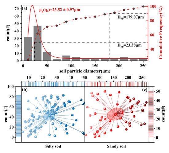 Statistical map of soil particle diameter in coastal wetlands. (a) Statistical results of soil particle diameter: Dn represents the particle diameter corresponding to n% of the soil; μg(q0) represents the geometric average of soil particle diameter; (b) Particle diameter distribution in silty soils; (c) Particle diameter distribution in sandy soils.