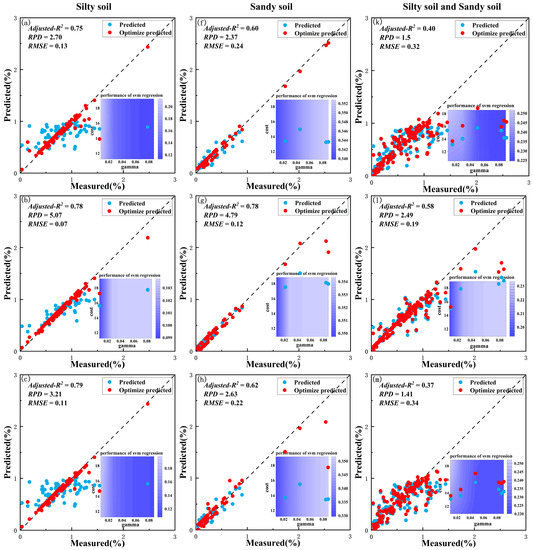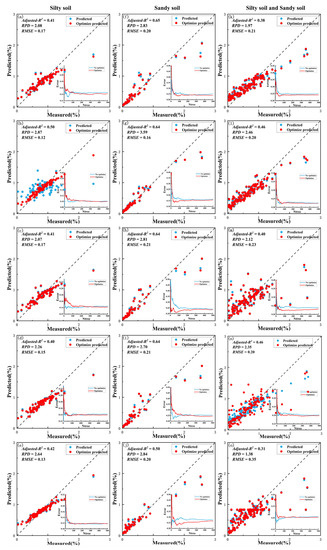 Figure 9 shows the optimized results of the ORFR model under two soil textures. The comparison between ORFR and OSVR shows that the optimized degree of the ORFR model is not as significant as that of the OSVR model. Still, the ORFR model also achieves the purpose of optimizing the model. The ORFR model also adjusts parameters Ntree and Ntry to reduce OBB error to improve the model performance. The Adjusted-R2 values are all greater than 0.4, and the highest value is 0.65, and the RPD values are all above 2.0, indicating that the model is stable and the uncertainty of the model has been reduced.