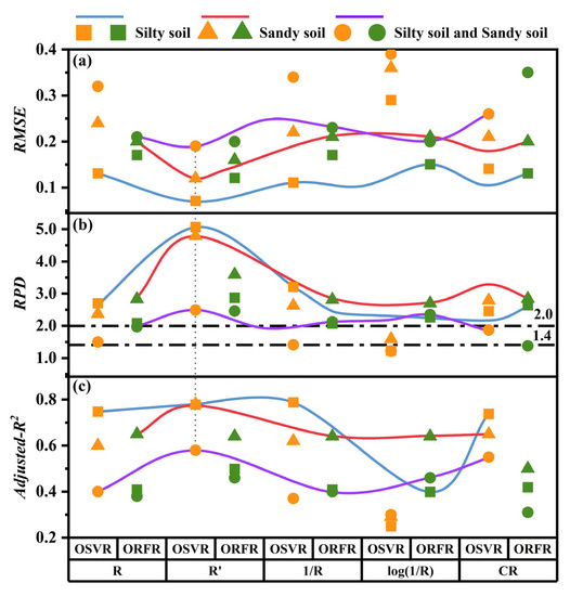 The results show that both methods can be used for modeling CW-SOC content and that the organic carbon prediction model of silty soil based on the OSVR method under R′ transformation is the best. The Adjusted-R2 value is as high as 0.78, the RPD value is 5.07, model stability is high, RMSE value is as low as 0.07 (Figure 10). The study found that the performance of the OSVR model is significantly higher than that of the SVR model, and the performance of the ORFR model is slightly higher than that of the RFR model, both of which achieved the purpose of improving the performance of the model (Figure 8 and Figure 9).