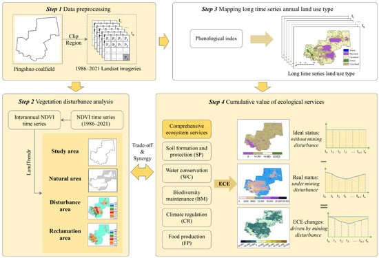 The assessment of a mine site’s ecological cumulative effects is conducted in two ways: the first is the actual computation of the real ecosystem cumulative value (RECV) of ecosystem services resulting from a surface coal mine’s real land use type shift from pre-mining to current mining condition; the second is the real ecosystem cumulative loss (RECL) due to complex human activities in the coal mine, which is calculated by estimating the ideal ecosystem cumulative value (IECV) without coal mining up to the present. The research was performed for a variety of ecosystem services and mine sites. The researchers also devised three total values for five services: soil creation and protection (SP), water conservation (WC), biodiversity maintenance (BM), climate control (CR), and food production (FP) [40]. Furthermore, the genuine cumulative ecological advantages of reclamation events were thoroughly investigated by (1) using Landsat images and the phenological index to identify the land use of the mining area in consecutive years (1986–2021), and (2) computing the value of ecosystem services as well as the cumulative ecosystem service value in consecutive years.
