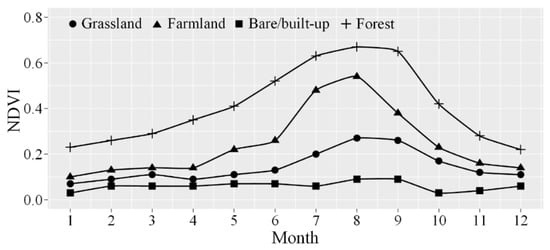 The land use classification and mining-specific cover types for the Pingshuo coal mine were determined comprehensively based on ecosystem differences, and the land use types of the Pingshuo coal mine were classified into four categories: arable land (including in situ landform arable land and reclaimed arable land), grassland (including in situ landform grassland and reclaimed grassland), forest land (including in situ landform forest land and reclaimed forest land), watershed, and other. Land use categories such as mining, settlements, and bare land are examples of other land uses, and the ecosystem service values of these land use types were treated as 0 values in the measurement method [36]. The study used the ability of this indicator to distinguish the spectral characteristics of agricultural land from grassland during the vegetation growing season to classify the full range of land use types classified, because NDVI has been shown to be one of the indices with superior effectiveness in distinguishing different types of vegetation, built-up land, and water bodies (Figure 3) [37]. The image element samples of remote sensing photos were labeled to distinguish all land cover types for the period 1986–2021 using the CART classification approach in machine learning [38].