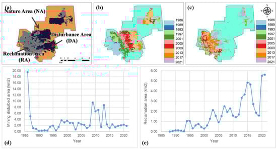 Year distribution map of disturbance and reclamation in Pingshuo coalfield. (a) The study region is divided into natural area (NA), disturbance area (DA), and reclamation area (RA); (b) temporal and spatial distribution of mining process; (c) temporal and spatial distribution of reclamation process; (d,e) the area of land exploited or reclaimed in each year.