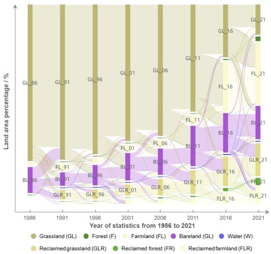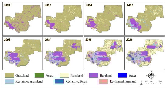 All the land use findings for the period 1986–2021 were identified using NDVI and phenological features (Figure 5). The classification results were chosen at 5-year intervals to highlight the essential elements of change. The grassland, bare land, cropland, forest land, water bodies, reclaimed grassland, reclaimed forest land, and reclaimed cropland land use classification focuses on the distribution characteristics of grassland, bare land, cropland, forest land, water bodies, reclaimed grassland, reclaimed forest land, and reclaimed cropland, as well as the spatial changes that occur over time. The findings of the mining disturbance and reclamation event identification demonstrate that mining disturbance and reclamation events were responsible for the changes in bare land. Before 2009, bare land expansion was most noticeable in the mine area’s southwest corner; after 2009, the focus of bare land changes shifted, with a rapid reduction in the southwest corner and a considerable expansion in the northeast corner. It can be seen that mining disturbance and reclamation events drive the shift of bare land in the mine region, and that, with different reclamation procedures, the land use status after reclamation includes three types, namely farmland, woodland, and grassland. Farmland growth has altered the environment, where grassland was the most important type of land use cover prior to 2009, resulting in a pattern where cropland surrounded bare land, and this continues to occur. Woodland, on the other hand, is primarily concentrated in the mine area’s southwest corner, and, as we can see from the mining disturbance data, the woodland here is primarily the product of the reclamation program of 1988, which was primarily woodland. This area evolved into a woodland-covered reclamation area over time, which, along with other areas dominated by cultivated land reclamation, formed an important reclamation strategy for this mine site. The presence of water bodies is, in fact, quite rare, and it can be seen that they are primarily owing to the accumulation of water in open-pit mine pits. Increased water bodies indirectly improve the mining area’s water retention capacity, which is actually favorable to the region’s natural environment.