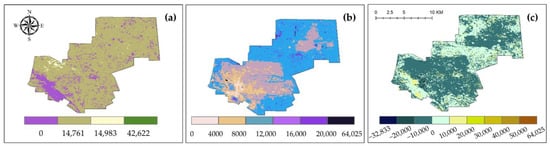 Individual ecosystem service functions contribute variably to various types of overall cumulative values, and individual functions also convey variances in nature’s ability to sustain human needs. As a result, the spatial measurements of each ecosystem service function in terms of ideal, actual, loss due to exploitation, and gain/loss due to reclamation were examined in this work (Figure 9 and Table 4). The individual service functions showed different trends in different utilization regions. Only the cumulative value of the food production function increased by 60.88 million RMB over 30 years of mining exploitation, with a rise of 23.01%, while the cumulative value of the remaining four service functions declined. It is noteworthy that, compared to the total amount of the study area, the climate regulation service had the smallest decrease (4.32%) and the soil protection service had the highest decrease (8.83%). It can be understood in NA that the cumulative value of all individual service functions is increasing, which may be due to natural factors such as climate change. Overall, both soil protection and biodiversity maintenance functions in NA increased very little, by only 1.44% and 0.29%. The biodiversity maintenance and food production functions increased by 6.89% and 47.12%, respectively. In DA, the cumulative values of all the service functions showed a decreasing trend and large variation. Soil protection, soil and water conservation, and biodiversity maintenance all decreased by more than 20%, 23.86%, 21.72%, and 24.20%, respectively, and the smallest food production function was 9.15%. This shows that the trends of disturbed areas and natural areas are completely in contrast, and the magnitude is much higher than that of natural areas, with the exception of food production. In RA, it can be seen that the cumulative value of losses still exists, but the magnitude is much smaller than in disturbed areas. The impact of reclamation on soil conservation and food production is minimal, with a loss of only 3.68 and 2.55 million RMB, while soil and water conservation, biodiversity, and climate regulation have a loss of more than 10 million RMB, which is, of course, related to the large total base of these three functions.