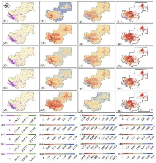 Changes in ECE for 5 ecological functions during 1986–2021. (a1–a5) Ideal ecological cumulative value (IECV), (b1–b5) real ecological cumulative value (RECV), (c1–c5) real ecological cumulative loss (RECL), (d1–d5) real restoration cumulative value (RRCV).