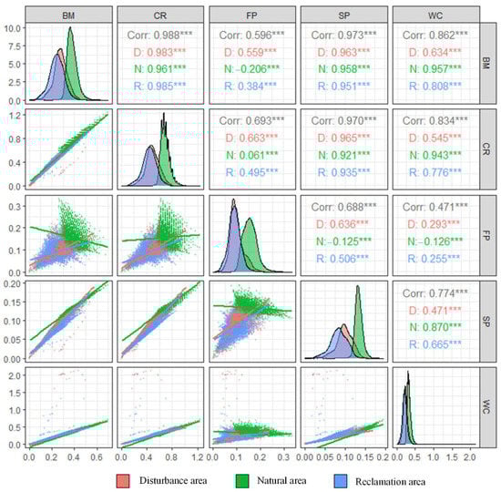There were 30 possible pairing outcomes based on the cumulative values contributed by each of the five ecosystem service functions in different types of locations, and all 30 pairs were substantially connected at the p < 0.001 level. Only three pairs had highly significant negative correlations, whereas twenty-seven had highly significant positive correlations (Figure 10). In general, except for FP, each service function’s cumulative value exhibited a highly significant positive correlation, while CR, BM, and SP had high Pearson correlation coefficients regardless of the area (r ranging from 0.921 to 0.985), indicating a strong synergistic link. With the cumulative value of each function, FP revealed spatially uneven Pearson correlation values ranging from −0.206 to 0.663. Only in the natural region did FP show significantly negative relationships with the cumulative value of the three service functions, BM, SP, and WC. Their Pearson correlation coefficients (r) ranged from −0.126 to −0.206, with an average of around −0.152, indicating that there is a general trade-off relationship. In conclusion, all service functions’ cumulative values demonstrate regular trade-offs and synergistic interactions. The great majority of service cumulative values will very certainly have a high degree of synergy between them. With the exception of FP, which, in natural regions, exhibits trade-offs with BM, SP, and WC, the cumulative value of each service exhibits varying degrees of synergistic interactions. With the exception of natural areas, FP generally exhibits sporadic synergistic interactions.