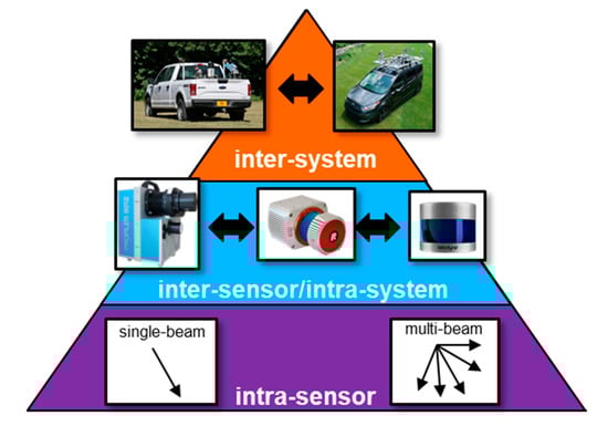- Inter-sensor/intra-system: the laser-beam-based normalization is utilized while replacing the laser beam ID with LiDAR scanner ID . More specifically, for an intensity captured by LiDAR scanner —denoted as a tuple —all cells containing such pair are identified. The normalized intensity of the pair is the average intensity of all points from other scanners over these cells.