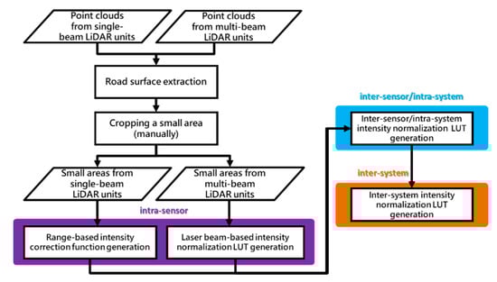 - Intra-sensor: the range-based intensity correction is applied for each single-beam LiDAR unit and the laser beam-based intensity normalization is conducted for every multi-beam LiDAR sensor.