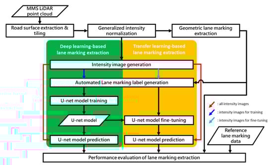 In this study, the learning-based lane marking extraction workflow as described in [14,15] is adopted. The major components associated with the adopted approach for network training are intensity image generation, lane marking annotation, and U-net model training and fine-tuning.