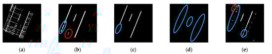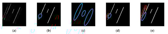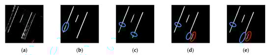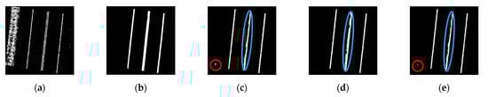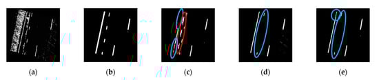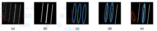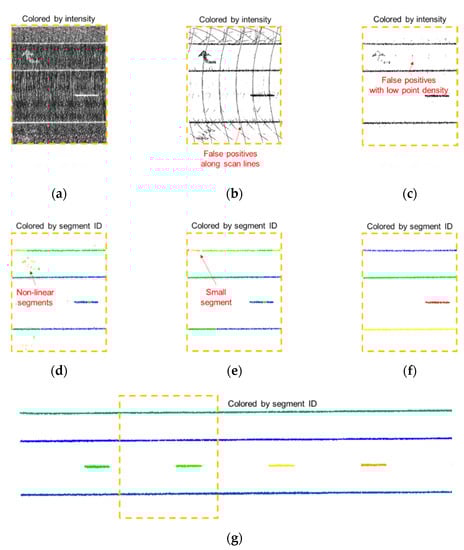 Next, a geometry-based strategy is conducted to remove (1) non-linear segments and (2) outlier points within a linear segment. A straight-line fitting is applied to each hypothesized lane marking segment. For each point in the segment, if its normal distance to the best-fitting line is smaller than a normal distance threshold (), it is regarded as an inlier; otherwise, it is removed. At the same time, the linearity of a lane marking segment is evaluated based on the ratio between the number of inliers and total points. If the inlier ratio of a segment is less than a pre-defined threshold (), it is regarded as a non-linear segment and removed. A sample result is illustrated in Figure 8e.