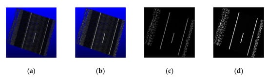 Upon removing the false positives along the scan lines, the remaining lane marking points (as displayed in Figure 8c) are grouped into isolated lane marking segments for easier manipulation. To achieve this, a density-based clustering algorithm—density-based spatial clustering of applications with noise (DBSCAN)—is adopted [25,26]. DBSCAN groups points in regions of high point density into clusters and labels the remaining points as “noise.” This algorithm requires two thresholds: a neighborhood distance threshold and a minimum number of neighboring points . In this study, these two thresholds are determined based on the LPS [20] of the point cloud along the road surface. After DBSCAN, all high-intensity clusters are regarded as lane marking segments while noise points are removed, as shown in Figure 8d.