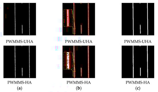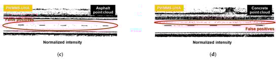 - Intensity normalization significantly improves the ability of Model-LN-UHA to handle PWMMS-HA data (F1-score increases by 86.2%)—see the example in Figure 20d. On the other hand, Model-LN-HA still shows a poor performance (F1-score lower than 6%) when testing on PWMMS-UHA data, as evident in Figure 21c. A possible reason for the poor performance is that the relatively high noise level in the PWMMS-HA data results in inferior quality of lane markings in the intensity images (an example can be found in Figure 10b).