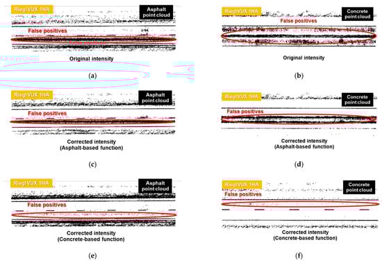 Hypothesized lane markings derived from: original intensity for sample (a) asphalt and (b) concrete regions; corrected intensity using asphalt-based function for sample (c) asphalt and (d) concrete regions; and corrected intensity using concrete-based function for sample (e) asphalt and (f) concrete regions.