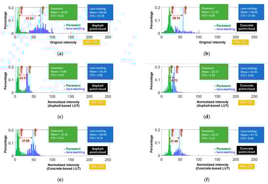 To inspect the intensity distribution before and after applying the asphalt- and concrete-based intensity correction, the intensity histograms of lane marking and pavement points (which have been manually classified) for the sample asphalt and concrete regions are shown in Figure 12. The y-axis of these histograms is the percentage, i.e., the count of the points in each bin divided by the total number of points in the relevant class. The use of percentage, rather than number of points, is for better visualization since the lane marking points are considerably less than pavement points (only around 5% of the points along the road surface are lane markings). According to the histograms, both the asphalt- and concrete-based functions can reduce the variability of the intensity distributions within each class (i.e., the standard deviations become smaller after applying intensity correction). The concrete-based function leads to lower variability as compared to the asphalt-based one (compare the standard deviations in Figure 12e,f to those in Figure 12c,d). The separation between lane marking and pavement classes (i.e., the difference between the mean values) increases after applying the asphalt-based function—compare the mean separation values in Figure 12a,b to those in Figure 12c,d; however, it does not necessarily become larger when using the concrete-based one—compare the mean separation values in Figure 12a,b to those in Figure 12e,f.