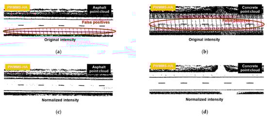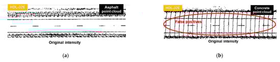 To compare the performance of the asphalt- and concrete-based correction functions, hypothesized lane markings before and after intensity correction were extracted by applying fifth percentile intensity thresholding to the sample point clouds, as shown in Figure 13. As evident in the figure, the hypothesized lane markings derived from concrete-based corrected intensity have fewer false positives (highlighted by the red circles) than their asphalt-based counterparts. The results indicate that a concrete-based function outperforms an asphalt-based one for separating lane marking and pavement regardless of pavement type. Therefore, a local area along concrete pavement should be utilized for intra-sensor intensity correction.