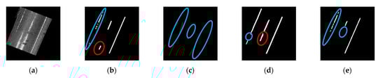 Sample lane marking extraction results for PWMMS-UHA data with normalized intensity on US-41/52: (a) intensity image and detections from (b) Model-G, (c) Model-LN-HA, (d) Model-LN-UHA, and (e) Model-LN-HA-UHA (red and blue circles highlight false positives and false negatives, respectively).