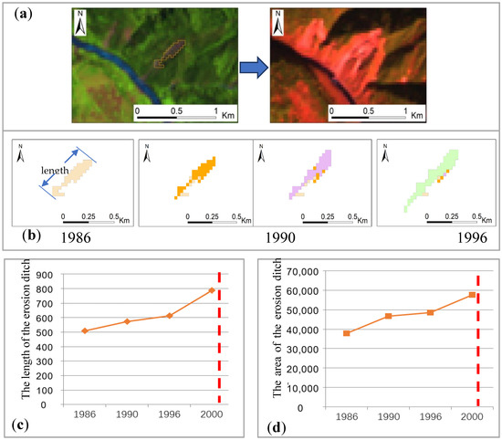 Likewise, using optical imagery, we detected an obvious erosion ditch on the east bank of a river valley on the Eastern Qinghai–Tibet Plateau; this ditch has been proven to be the precursor of a landslide that has occurred (Figure 3a). As shown in Figure 3b, the evolution of this erosion ditch was investigated using Landsat remote sensing images in different periods. Remote sensing images taken in 1986, 1990, 1996, and 2000 were selected to extract multispectral data, and the NDVI was constructed to classify the images. The relationship among the shape, aspect, and topography in the image was utilized to identify the location, length, and area of the erosion ditch in different periods and to observe the changes in and development of the erosion ditch over 14 years (the detailed classification steps are described in Section 3.2). We found that the erosion ditch gradually expanded over the 14-year period. According to the location of the edge of the erosion ditch, the erosion ditch expanded slowly in the first 10 years, and the expansion was concentrated mainly on the upper edge of the ditch far from the river channel. In the last four years, however, the rate of expansion of the erosion ditch accelerated, and the expansion area was concentrated mainly at the lower edge of the ditch near the river.