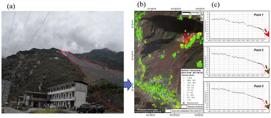 (a) Field photo of the Xinmo landslide. (b) Prefailure ground deformation map for the Xinmo landslide. (c) Representative deformation time series at measurement points in the source area (adapted with permission from [11]. 2018, Intrieri, E. et al.