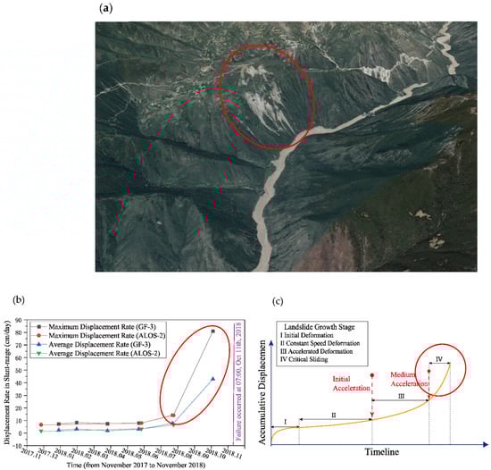 (a) Baige landslide (inside the red circle on the Google Earth image). (b) Temporal displacement patterns of the displacement rate as creep curves. (c) Temporal displacement patterns of the standard landslide model. The red circle on (b,c) indicate that the landslide entered a critical sliding stage and would soon enter the stage of failure. ((b,c) are adapted with permission from [133]. 2020, Jia et al.).