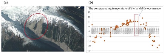 The time-series temperature data of the Mount Meager landslide area were selected to analyze the influence of temperature changes on the Mount Meager landslide. The temperature time-series data range from 1 January 2010 to 31 December 2010, including approximately 37 scenes of imagery. The temperatures at the Mount Meager landslide monitoring points were extracted, as shown by the orange squares in Figure 7b (the lines connecting some squares denote the corresponding temperature ranges at the landslide monitoring points). The red dotted rectangle delineates the timing of the landslide. Note again that the temperature continually increased before the landslide occurred, reached its peak, and tended to be stable. The landslide occurred after these high temperatures had persisted for a certain time and before the temperature could decrease, which indicates that the change in temperature was related to the occurrence of the landslide.