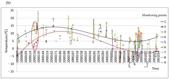 To determine the relationship between the evolution of the Yigong landslide and the changes in its geothermal environment, nine monitoring points were uniformly distributed across the upper part of the Yigong landslide, named Pt1–Pt9 (Figure 8a), and data from a MODIS multitemporal thermal infrared remote sensing product (MOD21A1D) were selected to extract the temperature at each monitoring point in the time series. The MODIS thermal infrared time-series data ranges from 27 March 2000 to 2 January 2001, including approximately 150 scenes of available images. Considering a uniform time series distribution and upon screening the quality of the data, 38 MODIS temperature images were selected from among the 150 images. The temperatures at the nine monitoring points were extracted, and the temperature change characteristics were fitted. The red line and black line in Figure 8b are the fitting curves of the temperatures at the monitoring points.