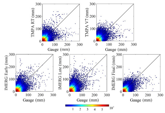 Scatterplots of daily precipitation comparison between five SPPs and rain-gauge observed precipitation.