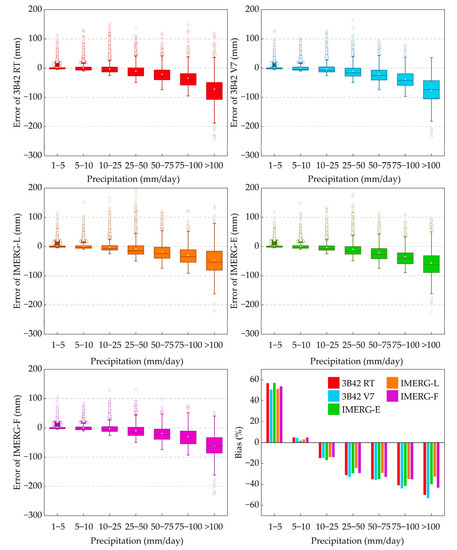 A box and whisker plot of the difference between the five SPPs and the observed precipitation for different rainfall intensities under-hit conditions is provided in Figure 3. It can be seen that all five sets of SPPs exhibited an overestimation of weak precipitation events and an underestimation of heavy precipitation events. In addition, the bias towards the underestimation of precipitation worsened as the intensity of precipitation increased. When the rainfall intensity was over 100 mm/day, the underestimated deviation of precipitation was more than 50 mm. Grossly overestimated anomalies were observed above the box line plots for each precipitation product, indicating that while the SPPs presented an underestimation of precipitation overall, a gross overestimation of specific precipitation persisted. For light precipitation events (1–10 mm/day), slight overestimations existed for all precipitation products, and the deviations were relatively close. For the higher precipitation events (>25 mm/day), the variation in the deviation of the SPPs was more pronounced. In particular, for precipitation intensities above 100 mm/day, the underestimation of IMERG-L was 46.1 mm, while that of 3B42V7 was as high as 76.5 mm. In general, the devaluation of the TMPA series was more pronounced than that of the IMERG series. The post real-time products of the same series showed a more significant underestimation than the near real-time products. Considering the significant underestimation of heavy precipitation events, improving the inversion accuracy of extreme rainfall events could serve as a direction for further improving the reliability of IMERG [36].