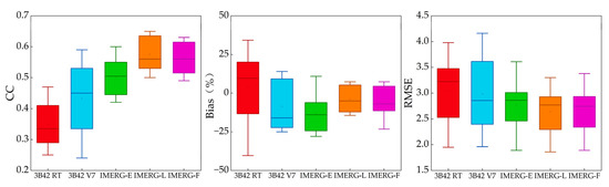 The performance of the eight precipitation events is shown in Figure 4. It is clear that 3B42RT was not satisfactory for heavy the precipitation events estimation. The improvement in accuracy of the post real-time product 3B42V7 over 3B42RT was limited. This may be because an underestimation of heavy precipitation is more likely to occur with satellite monitoring of the precipitation. For the IMERG series, with the most significant errors and mostly negative biases, IMERG-E showed a severe underestimation of precipitation. In comparison, the deviations of IMERG-L and IMERG-F were minor. It is worth noting that the average CC of the eight heavy precipitation events in the IMERG series all reached 0.5, and the average CC of IMERG-E, IMERG-L, and IMERG-F were 0.50, 0.58, and 0.56, respectively.
